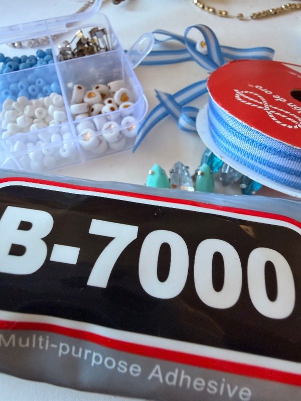 este kit contiene una cajita de 10 divisiones con 15 gemas grandes blancas y celestes, 30 gemas chicas blancas y 30 celestes. Cristal de roca blanco y celeste. Mostacillon , blanco y celeste. 20 bases de prendedor. Corazones dorados. Un pegamento b7000 de 110 ml y 10 metros de cinta bandera